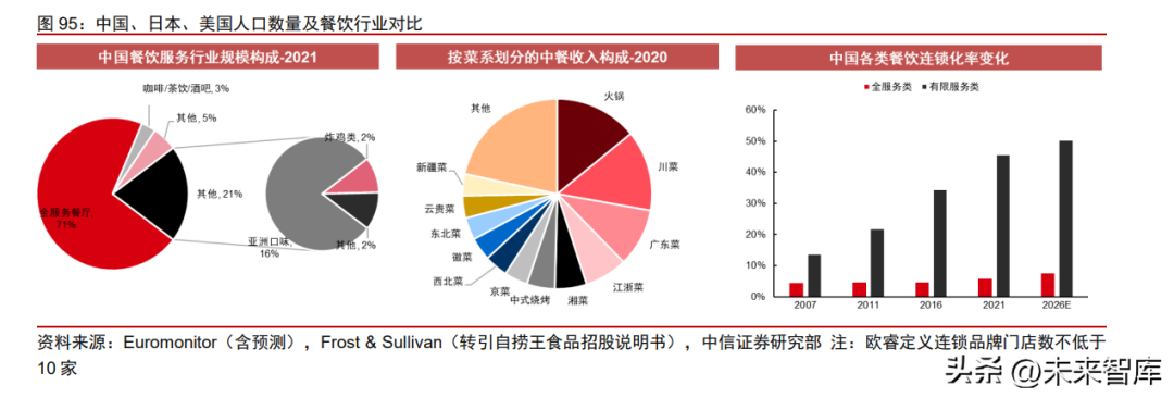 預(yù)制菜本質(zhì)為通過工業(yè)化批量生產(chǎn)針對性解決 BC 端痛點,其實已存在多年,湯圓、 水餃等針對 C 端的速凍面米制品,以及以 B 端為主的速凍火鍋料制品為典型代表,同樣經(jīng) 歷了從格局分散走向集中、標(biāo)準(zhǔn)化程度持續(xù)提升的過程,并且孕育了三全、思念、安井等 行業(yè)龍頭。作為 3.0 階段的狹義預(yù)制菜,雖然在品類復(fù)雜度、供應(yīng)鏈、應(yīng)用場景等方面, 均與速凍米面和速凍火鍋料存在較大差異,但在中國廣闊的市場規(guī)模,上下游環(huán)節(jié)的標(biāo)準(zhǔn) 化、規(guī)模化發(fā)展下,未來同樣望出現(xiàn)相應(yīng)龍頭企業(yè)。對比中國餐飲產(chǎn)業(yè)鏈與美國、日本的不同,我們認(rèn)為,未來預(yù)制菜將成為中國餐飲產(chǎn) 業(yè)鏈各環(huán)節(jié)發(fā)展、格局優(yōu)化的載體,因此目前預(yù)制菜產(chǎn)業(yè)鏈的各類參與者均具備發(fā)展機會, 能夠把握機遇的企業(yè)有望獲得成為大市值公司的可能。最終行業(yè)龍頭的形態(tài)取決于:(1) 上游原材料的標(biāo)準(zhǔn)化和規(guī)模化供應(yīng),(2)下游餐飲連鎖化率提升速度和最終狀態(tài),(3)菜 肴大單品出現(xiàn)節(jié)奏,(4)企業(yè)塑造品類競爭優(yōu)勢的可能性和能力。目前,這些因素均處于 發(fā)展初期。