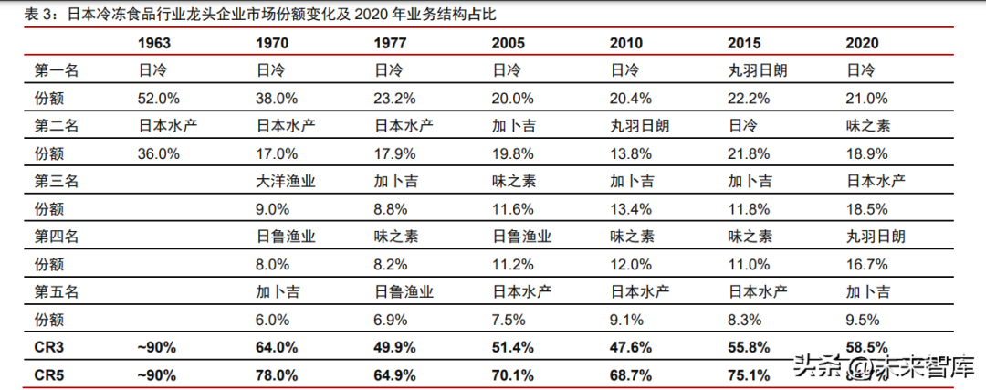集中度先降后升,長期保持較高水平,龍頭穿越周期地位穩(wěn)固。上世紀(jì) 60 年代之前,日 本冷凍食品行業(yè)參與者以水產(chǎn)、遠(yuǎn)洋捕撈企業(yè)為主。上世紀(jì) 50 年代初期在朝鮮戰(zhàn)爭背景下這 些企業(yè)主要向美軍提供軍需,隨后產(chǎn)能過剩,在日本“中小學(xué)供膳計劃”下主要向?qū)W校提供凍 魚、凍肉等產(chǎn)品,1963 年日冷及日本水產(chǎn)合計市場份額約 90%。隨著 BC 端對冷凍食品接受 度提高、政府支持冷凍食品企業(yè)發(fā)展,上世紀(jì) 70 年代起雪印乳業(yè)、味之素等企業(yè)跨界進入, 參與者數(shù)量不斷增加,行業(yè)競爭開始加劇。2000 年,日本冷凍食品企業(yè)數(shù)量達到峰值 969 家, 行業(yè) CR3 也降至 50%左右。之后在行業(yè)增長放緩、競爭持續(xù)加劇的背景下,部分中小企業(yè)逐 步退出市場,行業(yè)并購整合現(xiàn)象增加,企業(yè)數(shù)量減緩至 2020 年 442 家,單個企業(yè)平均產(chǎn)量及 平均產(chǎn)值呈持續(xù)上升趨勢,集中度也同步提升,2020 年行業(yè) CR3 約 59%。雖然在數(shù)十年時間里行業(yè)經(jīng)歷了較大起伏,但龍頭企業(yè)地位長期保持穩(wěn)定,前五名企業(yè) 在上世紀(jì)70年代后基本沒有變動,其中日冷連續(xù)多年保持行業(yè)第一,2020年市場份額約21%。