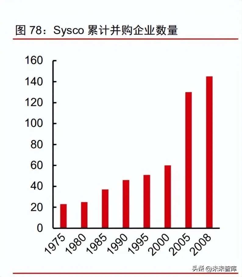 飲食文化較為簡單,餐廳具備高連鎖化率與較高集中度。美國有限服務(wù)餐廳占比 51%, 同時飲食文化較為簡單,漢堡、炸雞、披薩三類餐廳合計占有限服務(wù)餐廳比例達到 64%。美國餐飲連鎖化起步較早,肯德基、麥當(dāng)勞等快餐巨頭均在上世紀(jì)五六十年代開啟擴張, 并在美國外出就餐率提升下實現(xiàn)快速成長,2021 年各類有限服務(wù)餐廳連鎖化率均高于 70%,龍頭份額也高于 20%,連鎖化率與集中度均處于較高水平。上下游高標(biāo)準(zhǔn)化催生餐飲供應(yīng)鏈企業(yè),Sysco 通過多次并購進行行業(yè)整合。隨著下游 連鎖餐飲企業(yè)往全國擴張,建立標(biāo)準(zhǔn)化供應(yīng)鏈的需求愈發(fā)強烈。美國餐飲上游供應(yīng)鏈具備 較好的集中度和規(guī)模化,疊加物流、冷鏈等基礎(chǔ)設(shè)施從上世紀(jì)六七十年代同步完善,餐飲 供應(yīng)鏈企業(yè)隨即誕生。