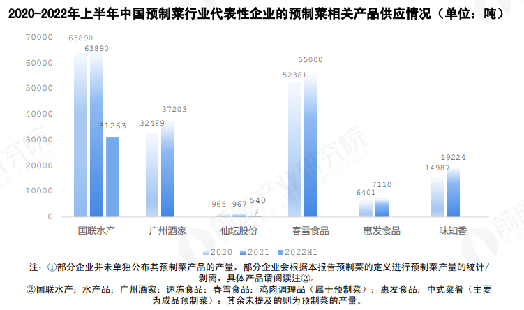 2020-2021年,中國預制菜行業代表性企業的預制菜產量幾乎均有所增長,但國聯水產的水產品則有所下降;此外的廣州酒家、仙壇股份、春雪食品、惠 發食品和味知香的預制菜相關產品產量均有所增長。以味知香為例,2021年,味知香的預制菜產品產量為1.92萬噸,相較2020年產量增長了28.27%。整體來看,預制菜行業代表性企業的產量供應呈增長的態勢,中國預制菜行業供應情況較為良好,且部分企業也有擴大產能的趨勢,例如春雪食品于2022年3月份投資2.46億元建設的“年產4萬噸雞肉調理品智慧工廠項目”開工,預計2022年12月份投產,年新增雞肉調理品設計產能4萬噸。