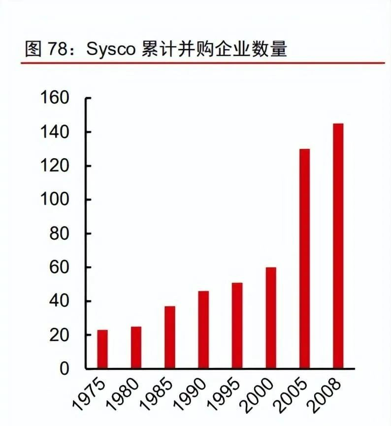 1969 年,Sysco由9家食品配送商合并成立,并在第二年實現上市。此后,公司不斷通過并購迅速進入新市場,再通過標準化改良和管理系統輸出,拓寬產品范圍、提升盈利能力,做大規模,80年代末已成為美國第一大食品分銷商。