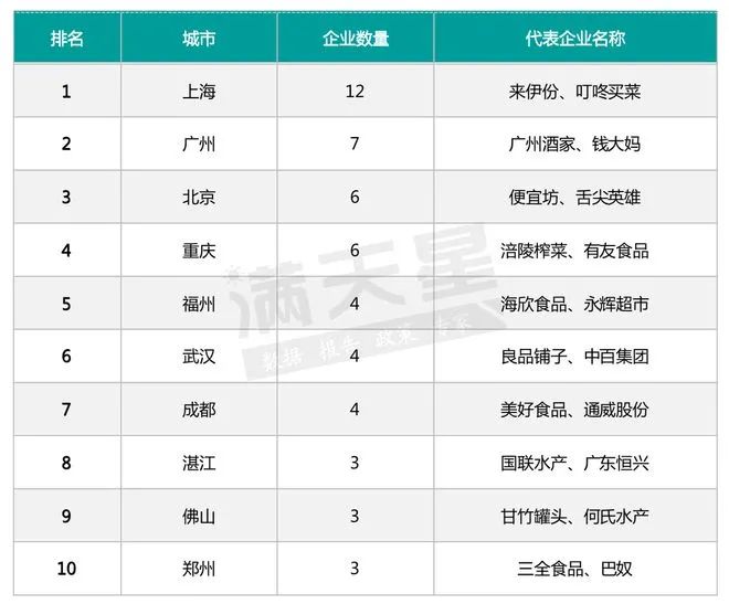 上海在榜單中的代表企業有來伊份、叮咚買菜,廣州的代表企業有廣州酒家、錢大媽,北京的代表企業有便宜坊、舌尖英雄等。