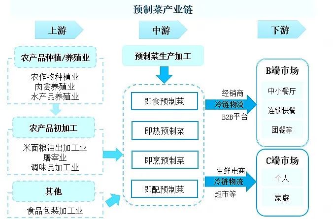 早在上世紀 90 年代,國內便出現了凈菜(指洗凈后的菜),21世紀初,我國陸續出現半成品生產企業,對肉禽和水產等原材料進一步加工。2000年后深加工的半成品菜企業開始涌現,預制菜由此拉開帷幕。但由于條件不成熟,行業整體發展較為緩慢。直到2014年,預制菜行業在B端步入放量期,C端在疫情蔓延居家隔離時期迎來消費消費加速期。2019年我國預制菜市場規模約2445億元,其中B端市場為1956億元,C端市場489億元。隨著消費升級以及冷鏈物流布局,預制菜市場將向B、C端同時加速發展。
