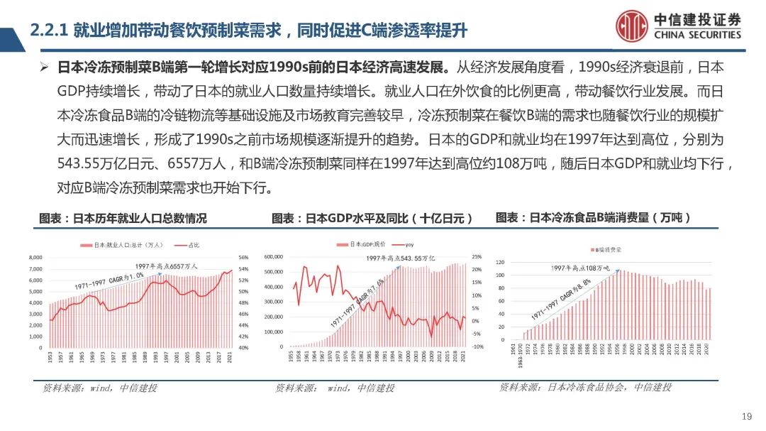 (1)隨著宏觀經(jīng)濟(jì)的發(fā)展,首先帶來就業(yè)人口的增長。就業(yè)人口相比居家人口,在外飲食的場景相對更多,也會 帶動餐飲業(yè)發(fā)展,對應(yīng)的B端預(yù)制菜需求增長。其次,就業(yè)人口回家做飯的時(shí)間少,烹飪的時(shí)間成本提高,也推動 預(yù)制菜在C端居家消費(fèi)場景的滲透率提升。此外,1960s日本冷鏈物流等基礎(chǔ)設(shè)施的加速建設(shè),以及1970s冰箱等 家電的基本普及,給B端和C端預(yù)制菜發(fā)展提供基礎(chǔ)。包括連鎖餐飲企業(yè)的發(fā)展、連鎖便利店的擴(kuò)張,也在持續(xù)擴(kuò) 張對預(yù)制菜的需求。