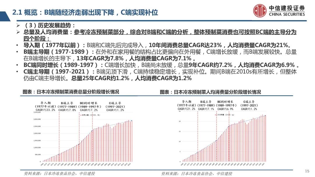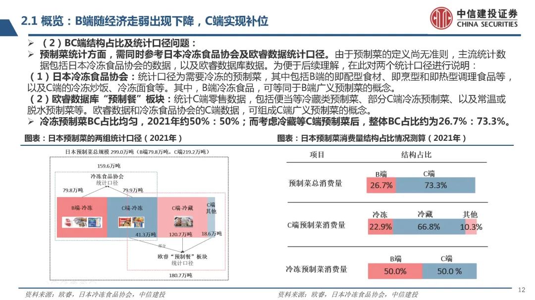 (2)BC端結(jié)構(gòu)占比及統(tǒng)計(jì)口徑問題:預(yù)制菜統(tǒng)計(jì)方面,需同時(shí)參考日本冷凍食品協(xié)會及歐睿數(shù)據(jù)統(tǒng)計(jì)口徑。由于預(yù)制菜的定義尚無準(zhǔn)則,主流統(tǒng)計(jì)數(shù) 據(jù)包括日本冷凍食品協(xié)會的數(shù)據(jù),以及歐睿數(shù)據(jù)庫數(shù)據(jù)。