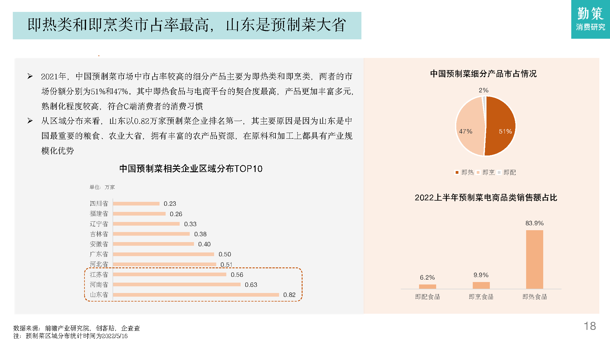 即熱類和即烹類預制菜市場占有率最高,其中山東地區成為預制菜的發展熱點。即熱類和即烹類預制菜以其方便快捷的特點受到消費者的廣泛歡迎。