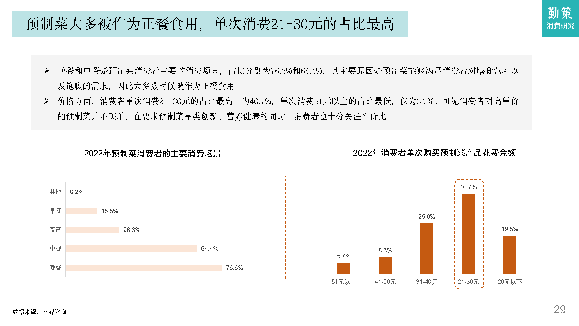 報告還指出,預制菜大多被作為正餐食用,其中單次消費21-30元的占比最高。消費者購買預制菜主要是為了解決正餐需求,而在價格方面,大部分消費者愿意在21-30元之間進行消費。