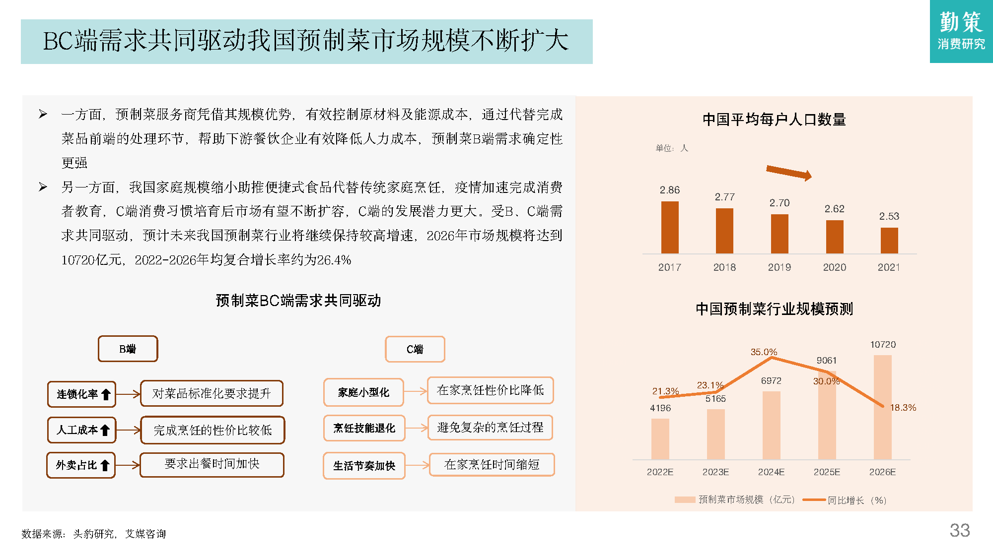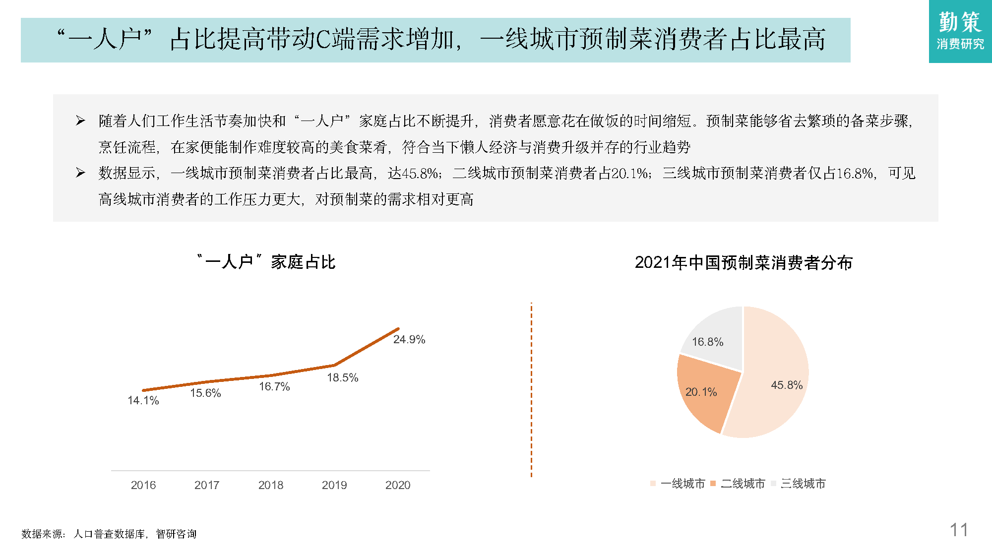 隨著“一人戶”人口占比的提高,C端對預制菜的需求也在逐步增加。在一線城市,預制菜消費者的占比最高,居民們忙碌的生活節奏使得他們更加依賴方便快捷的預制菜產品。