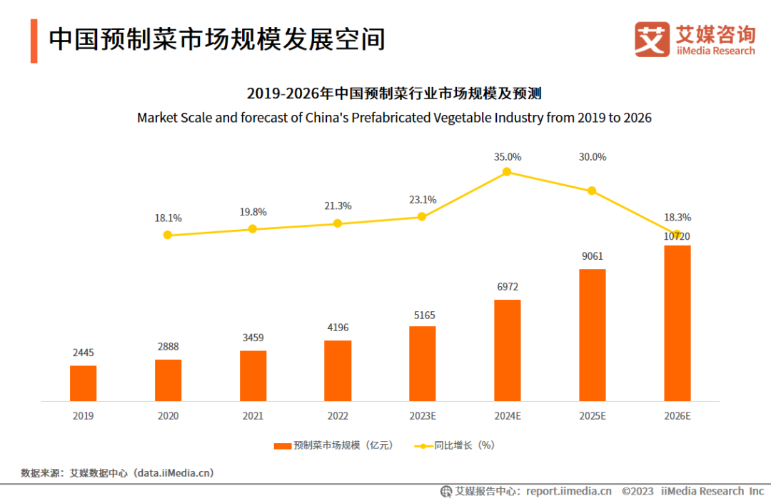 iiMedia Research(艾媒咨詢)數據顯示,2022年中國預制菜市場規模為4196億元,同比增長21.3%,預計未來中國預制菜市場保持較高的增長速度,2026年預制菜市場規模將達10720億元。預制菜有效地降低了餐廳運營成本,順應了當下消費者便捷、營養的飲食需求,吸引各大連鎖餐飲品牌入行布局。