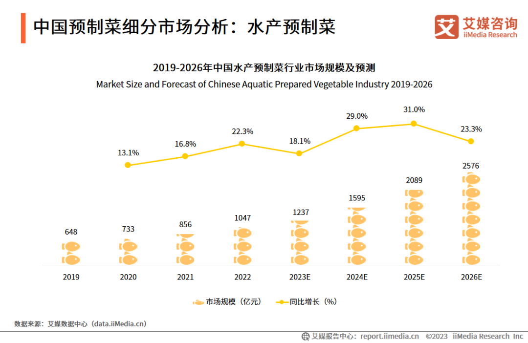 iiMedia Research(艾媒咨詢)數據顯示,2022年中國水產預制菜行業規模為1047億元,同比增長22.3%,預計2026年水產預制菜市場規模將達2576億元。隨著人們飲食的多元,消費結構的升級,水產預制菜市場將持續擴大規模。