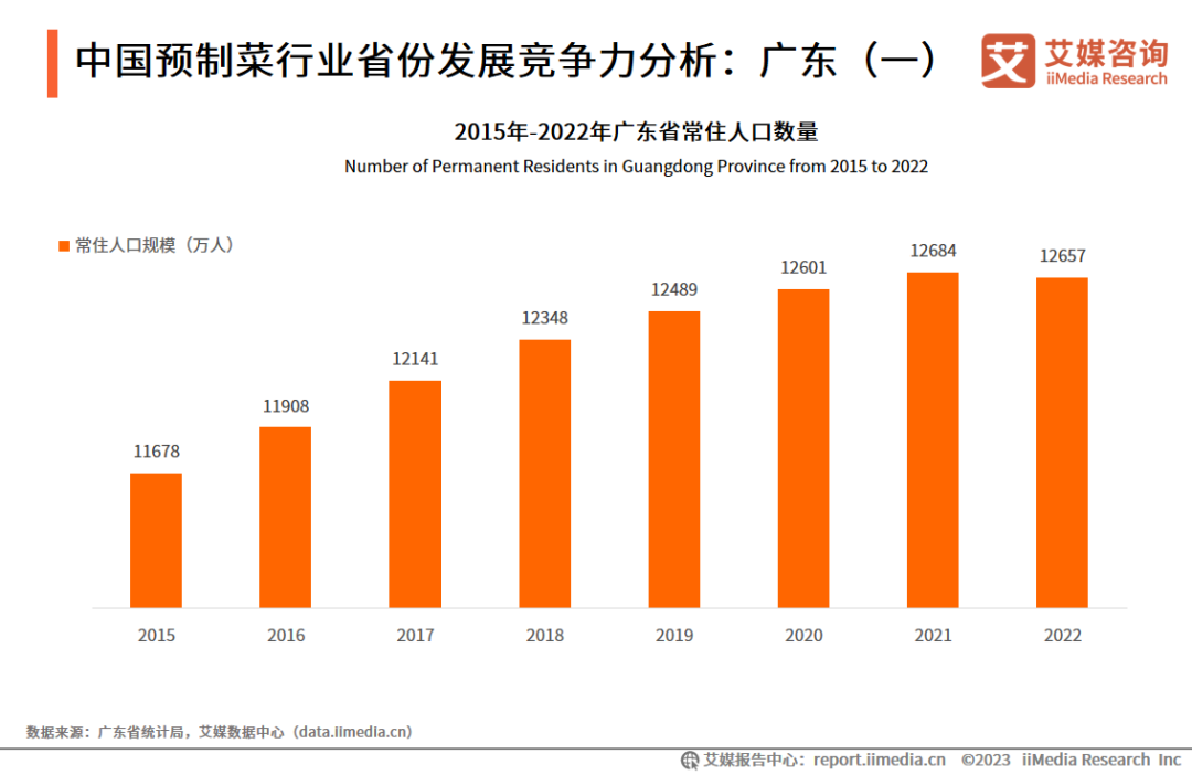 數據顯示,2015-2022年,廣東省常住人口數不斷上升,從2015年的11678萬人上升至2022年的12657萬人。經濟的發達、落戶政策的優化等都吸引了大量人才入戶廣東,促進廣東省常住人口的持續增長。廣東省人口量大,日常消耗食品量大,具備較強的預制菜產品消費潛力。