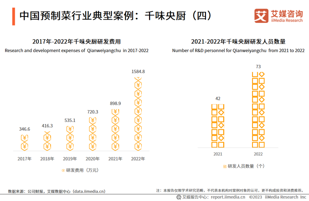 數據顯示,2017年-2022年,千味央廚研發費用投入逐年增多。其中,2022年的研發費用為1584.8萬元,同比增長 76.29%。與此同時,2022 年千味央廚研發人員達到73 人,同比增加了 73.81%。近年來各大預制菜企業愈發重視產品研發,試圖搶占預制菜賽道先機,占據市場份額。