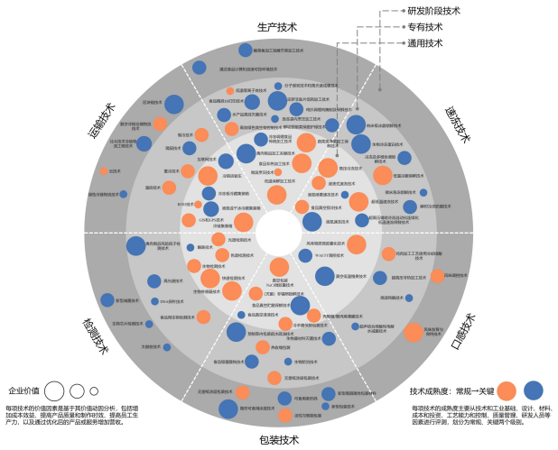 (一)全國預(yù)制菜技術(shù)路線圖從生產(chǎn)、加工、儲運、消費環(huán)節(jié)涉及的科學(xué)與技術(shù)角度分析,預(yù)制菜是以農(nóng)產(chǎn)品為原料,融合傳統(tǒng)烹飪技藝、食品科學(xué)以及現(xiàn)代食品加工技術(shù),多采用機械化、自動化、智能化的先進裝備,進行工業(yè)化、標(biāo)準(zhǔn)化生產(chǎn)的成品或半成品預(yù)包裝菜肴制品。預(yù)制菜加工工藝因不同菜品的品質(zhì)要求、烹飪方式、包裝和貯運要求而不同,但主要的加工技術(shù)大致相同,涉及生產(chǎn)技術(shù)、速凍技術(shù)、口感技術(shù)、包裝技術(shù)、檢測技術(shù)、運輸技術(shù)六大方面。根據(jù)技術(shù)的價值可分為通用技術(shù)、專有技術(shù)、研發(fā)階段技術(shù)。