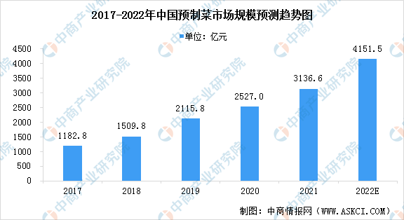 預制菜在餐飲和居家消費的雙重推動下迎來行業風口。數據顯示,我國預制菜行業市場規模由2017年的1182.8億元增至2020年的2527億元,年均復合增長率為28.8%。隨著冷鏈物流及宅經濟的發展,預計2022年我國預制菜行業市場規模將進一步達到4151.5億元,同比增長32.4%。
