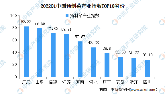 近期,依據宏觀經濟、消費水平、預制菜企業數量、上市/融資企業數量與規模、網民關注度以及政策扶持力度等維度,NCBD發布了《2022Q1中國預制菜產業指數省份排行榜》。榜單顯示,我國預制菜產業指數排名前十的省份分別為廣東、山東、福建、江蘇、河南、河北、遼寧、安徽、浙江及四川。廣東以82.32的產業指數,蟬聯榜首。