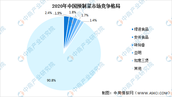 我國預制菜目前處于起步發展階段,市場參與企業眾多,專業預制菜生產企業、大型餐飲企業、食品及供應鏈企業、商超、便利店等企業也紛紛入局,行業門檻較低。2020年預制菜行業CR10僅為13.6%, CR5僅為9.2%,其中綠進食品、安井食品、味知香分別占比2.4%、1.9%、1.8%。