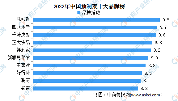最新數據顯示,我國預制菜品牌指數TOP10分別為味知香、國聯水產、千味央廚、正大食品、鮮到家、新雅粵菜館、王家渡、好得睞、聰廚、谷言。其中,味知香以9.9的品牌指數得分排名第一;其次,國聯水產、千味央廚、正大食品和鮮到家的品牌指數分別為9.7、9.6、9.3、9.2,進入預制菜品牌指數前五。