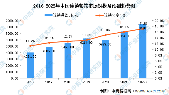 下游連鎖餐飲市場規模將達8418億元。中國連鎖餐飲的市場規模近幾年不斷擴大,快餐、送餐外賣、火鍋連鎖店、團體供餐發展迅速,連鎖經營已經成為許多地區餐飲業的主導經營模式。據相關數據顯示,中國連鎖餐飲市場規模由2016年的4021億元增加至2021年的7263億元,年復合增長率約為10.2%,預期將于2022年進一步增加至的8418億元。