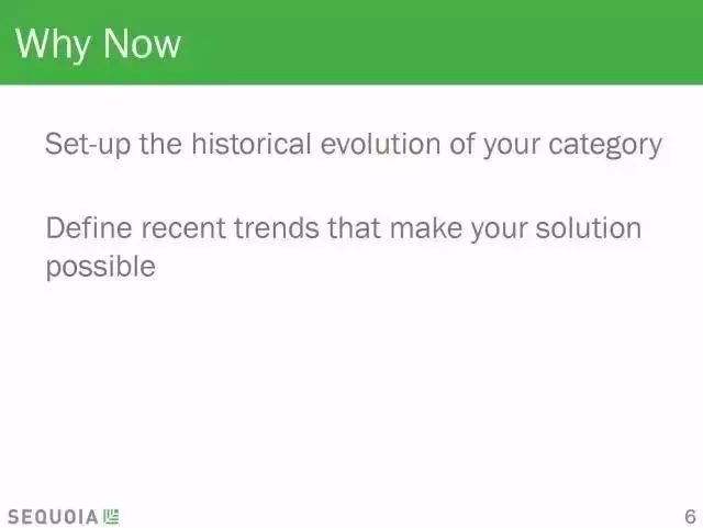 最好的公司幾乎總是很清楚為什么當下其最好的時機。大自然的發展容不下真空期——為什么你的解決方案之前沒有出現過呢?