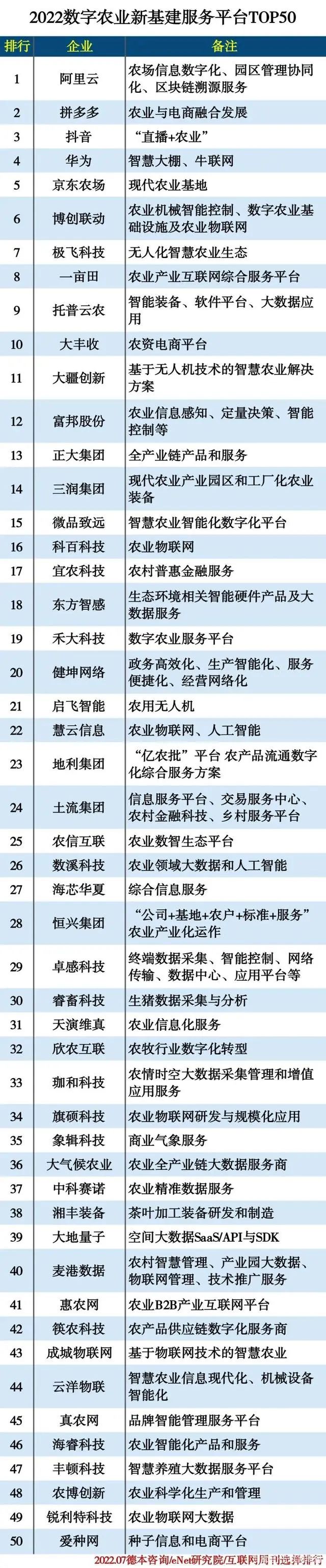 【智慧農(nóng)業(yè)】2022數(shù)字農(nóng)業(yè)新基建服務(wù)平臺(tái)TOP50發(fā)布