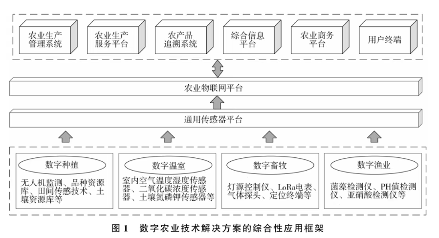 數字農業的發展為農業生產提供了創新性技術方案。數字農業涵蓋數字種植?數字溫室?數字畜牧?數字漁業及數字農產品溯源等眾多應用場景,數字應用場景是農業農村生產生活各個領域與信息化深度融合的適用情景,它們共同致力于構建一個高度集成?自動化和智能化的現代農業生產生活體系。本研究將數字農業基于各類應用場景所提供的技術方案,統稱為數字農業技術解決方案的綜合性應用框架(圖1)。