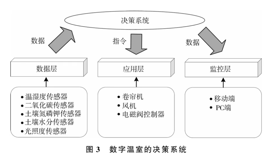 青州市YX溫室園藝有限公司,為花卉?蔬菜?種苗繁育?養殖及畜牧業等眾多領域的數字溫室工程設計與承建提供全面解決方案。該系統通過先進的信息采集設備,如溫濕度傳感器?二氧化碳傳感器?土壤電導率傳感器等,實時監測溫室內部的環境狀態,確保數據的實時性和準確性。在數據采集后,數字溫室系統通過其內置的數字化模型進行深入分析和處理。基于復雜的算法和數據分析技術,系統能夠對收集到的數據進行深度解析,識別出作物生長的最佳環境條件,將分析結果進一步轉化為具體的生產決策。智能溫室利用無線通信技術與智能農機設備實時連接,根據系統提供的決策建議,智能農機設備能夠自動執行相關的農業操作,實現灌溉?施肥?通風?遮陽?加溫等多個方面的調節,進一步提升農業生產的自動化和智能化水平。同時,系統通過軟硬件的融合,不僅優化了作物生長環境,還能收集農田操作數據和作物收成等關鍵信息,形成一個完整的信息閉環,為農業生產提供持續的數據支持和優化建議,該系統具體架構如圖3所示。
