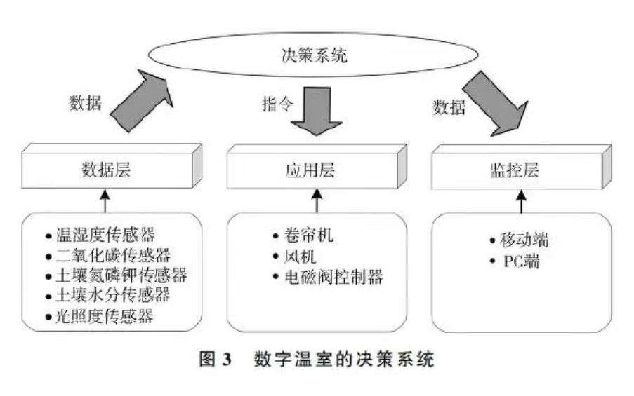 青州市YX溫室園藝有限公司,為花卉、蔬菜、種苗繁育、養殖及畜牧業等眾多領域的數字溫室工程設計與承建提供全面解決方案。該系統通過先進的信息采集設備,如溫濕度傳感器、二氧化碳傳感器、土壤電導率傳感器等,實時監測溫室內部的環境狀態,確保數據的實時性和準確性。在數據采集后,數字溫室系統通過其內置的數字化模型進行深入分析和處理。基于復雜的算法和數據分析技術,系統能夠對收集到的數據進行深度解析,識別出作物生長的最佳環境條件,將分析結果進一步轉化為具體的生產決策。智能溫室利用無線通信技術與智能農機設備實時連接,根據系統提供的決策建議,智能農機設備能夠自動執行相關的農業操作,實現灌溉、施肥、通風、遮陽、加溫等多個方面的調節,進一步提升農業生產的自動化和智能化水平。同時,系統通過軟硬件的融合,不僅優化了作物生長環境,還能收集農田操作數據和作物收成等關鍵信息,形成一個完整的信息閉環,為農業生產提供持續的數據支持和優化建議,該系統具體架構如圖3所示。