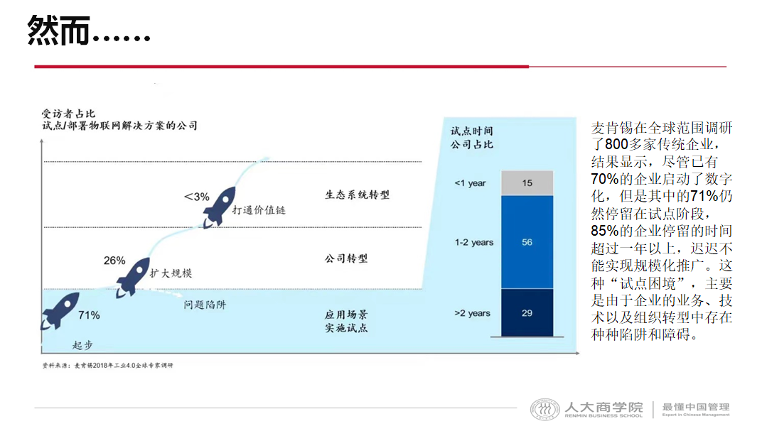 在麥肯錫的全球調(diào)研中發(fā)現(xiàn),800家企業(yè)中,70%以上的企業(yè)啟動(dòng)數(shù)字化轉(zhuǎn)型,但是其中的71%仍然停留在試點(diǎn)階段,都在做0到1的探索。
