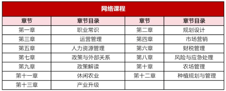網絡培訓內容主要圍繞職業認知與道德、農業政策解析、農業基礎知識、涉農經濟組織經營管理知識、農業創新思維與方法的相關知識、智慧農業、農耕文化傳承與發展、相關法律等內容展開。
