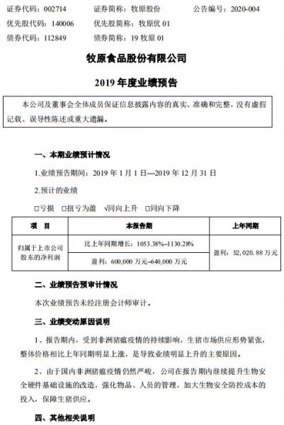 近日,牧原股份發布了 2019 年度業績預告。報告期內,公司預計實現歸屬于上市公司股東的凈利潤為 60~64 億元,同比增長 1053.38%~1130.28%。