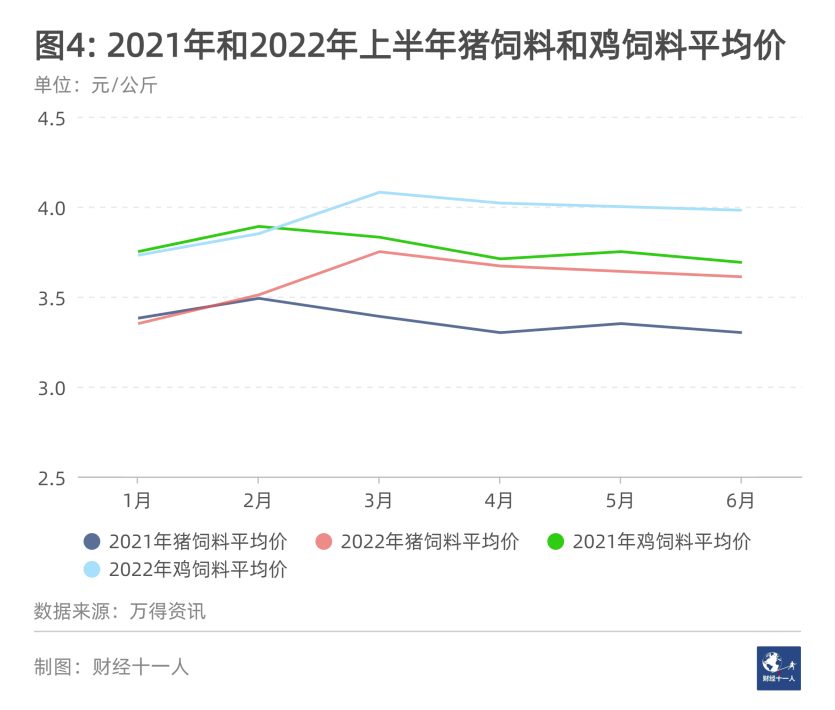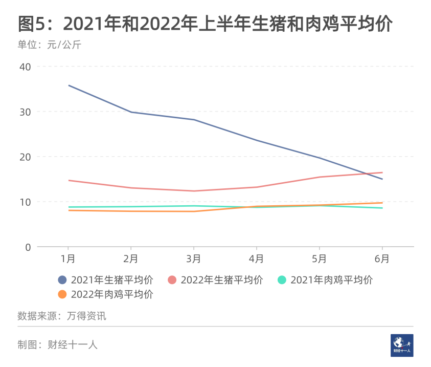 2022年上半年,飼料價格連續(xù)上漲推高養(yǎng)殖成本(圖4)。當(dāng)期豬價總體低迷,顯著低于2021年同期(圖5);雞價和2021年同期持平(圖5)。以上原因?qū)е吗B(yǎng)殖行業(yè)盈利下降。隨著未來酒店、食堂和團(tuán)餐等聚集性消費(fèi)逐步放開,養(yǎng)豬養(yǎng)雞行業(yè)的利潤會有所好轉(zhuǎn)。