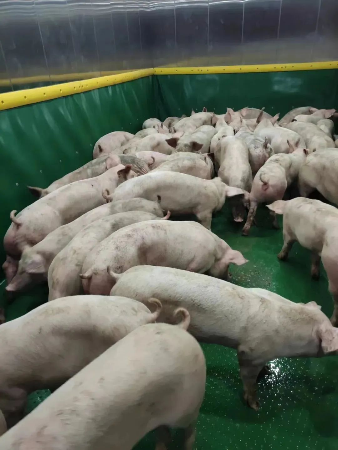 在地下一層,一共有6部大型貨梯,一次運送240多頭生豬上樓,最后在飼養員的帶領下,從頂層順次向下,分別“入住”它們的專屬“房間”。