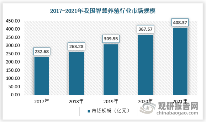 近年來隨著物聯(lián)網(wǎng)、大數(shù)據(jù)、傳感器等產(chǎn)業(yè)的發(fā)展,畜牧業(yè)的智慧化程度不斷提升,我國(guó)智慧養(yǎng)殖行業(yè)市場(chǎng)規(guī)模不斷擴(kuò)大,截止到2021年底,我國(guó)智慧養(yǎng)殖行業(yè)市場(chǎng)規(guī)模達(dá)到408.37億元。