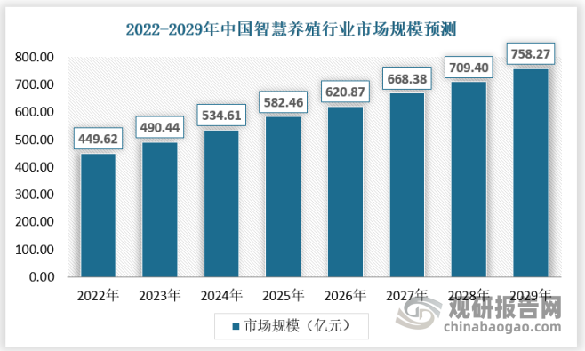 當(dāng)前,我國(guó)智慧養(yǎng)殖滲透率還不高,但從長(zhǎng)期來看,養(yǎng)殖智能化已經(jīng)是養(yǎng)殖行業(yè)的發(fā)展趨勢(shì),隨著養(yǎng)殖業(yè)規(guī)模化經(jīng)營(yíng),養(yǎng)殖企業(yè)對(duì)經(jīng)營(yíng)效率的需求將會(huì)越來越高,而智慧養(yǎng)殖可以推進(jìn)畜牧業(yè)提升養(yǎng)殖效率、規(guī)范養(yǎng)殖標(biāo)準(zhǔn)、完善養(yǎng)殖信息收集、加強(qiáng)食品安全建設(shè)。預(yù)計(jì)未來智慧養(yǎng)殖的滲透率將持續(xù)提升,行業(yè)市場(chǎng)規(guī)模將保持穩(wěn)定增長(zhǎng),到2029年將達(dá)到758.27億元。