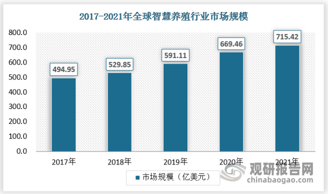 近年來,養(yǎng)殖業(yè)在市場(chǎng)需求和科技發(fā)展的雙重推動(dòng)下,逐步升級(jí)養(yǎng)殖規(guī)模、提高養(yǎng)殖品質(zhì),全球智慧養(yǎng)殖行業(yè)市場(chǎng)規(guī)模不斷擴(kuò)大,2021年達(dá)到了715.42億元。