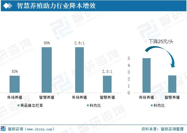 以牧原股份智能養(yǎng)豬場(chǎng)為例,采用數(shù)字化智能養(yǎng)豬系統(tǒng)后,有效的降低勞動(dòng)力、水電等生產(chǎn)成本,商品豬平均每頭可降低25元,商品豬出欄率從85%提高到90%;料肉比由2.6:1提高到2.5:1。