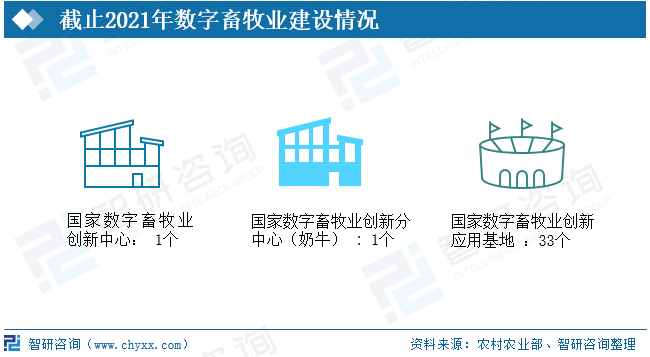在政策的支持下,截至2021年底,已建設(shè)1個(gè)國(guó)家數(shù)字畜牧業(yè)創(chuàng)新中心、1個(gè)國(guó)家數(shù)字畜牧業(yè)創(chuàng)新分中心(奶牛)、33個(gè)國(guó)家數(shù)字畜牧業(yè)創(chuàng)新應(yīng)用基地(其中支持內(nèi)蒙古自治區(qū)1個(gè)),創(chuàng)新中心與應(yīng)用基地的建設(shè)可為智慧養(yǎng)殖的發(fā)展開展前沿性技術(shù)的研發(fā),開展相關(guān)技術(shù)產(chǎn)品集成應(yīng)用、熟化、示范推廣等。
