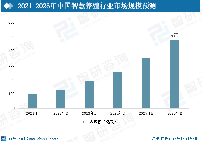 智慧養(yǎng)殖作為智慧農(nóng)業(yè)組成之一,建設(shè)仍處于初期階段,2021年市場(chǎng)規(guī)模為98億元左右,未來在政策鼓勵(lì)及技術(shù)不斷創(chuàng)新下,中國(guó)智慧養(yǎng)殖建設(shè)不斷加速,將有越來越多的養(yǎng)殖企業(yè)將新興技術(shù)運(yùn)用到養(yǎng)殖中,預(yù)計(jì)到2026年行業(yè)市場(chǎng)規(guī)模將達(dá)477億元。