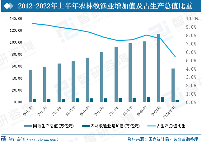 養(yǎng)殖業(yè)在我國(guó)發(fā)展歷史悠久,是我國(guó)農(nóng)業(yè)主導(dǎo)產(chǎn)業(yè)之一。2021年中國(guó)農(nóng)林牧漁業(yè)增加值為8.68萬億元,占生產(chǎn)總值的7.6%。2022年上半年農(nóng)林牧漁業(yè)增加值為3.06萬億元,占生產(chǎn)總值的5.4%。