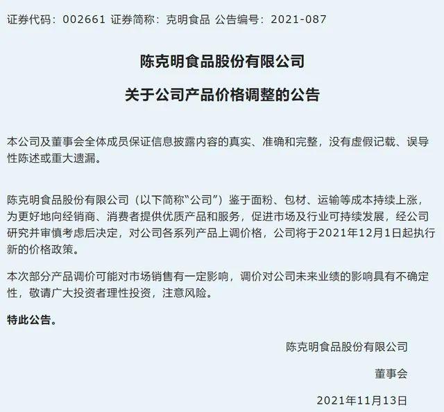 2021年11月,克明食品公告稱,對公司各系列產品上調價格,將于2021年12月1日起執行新的價格政策,但未提及漲價幅度。這是這家“面業第一股”自2012年上市以來首次公告提價。