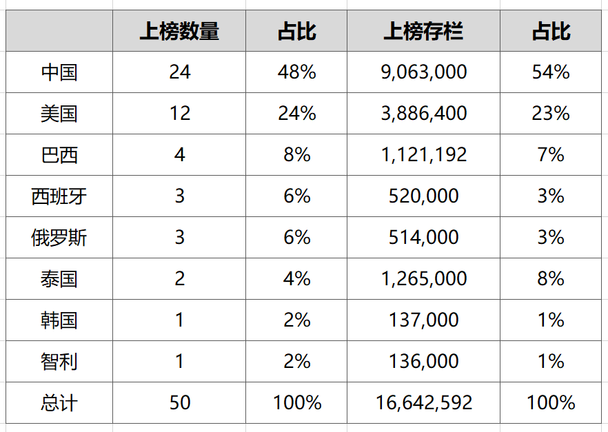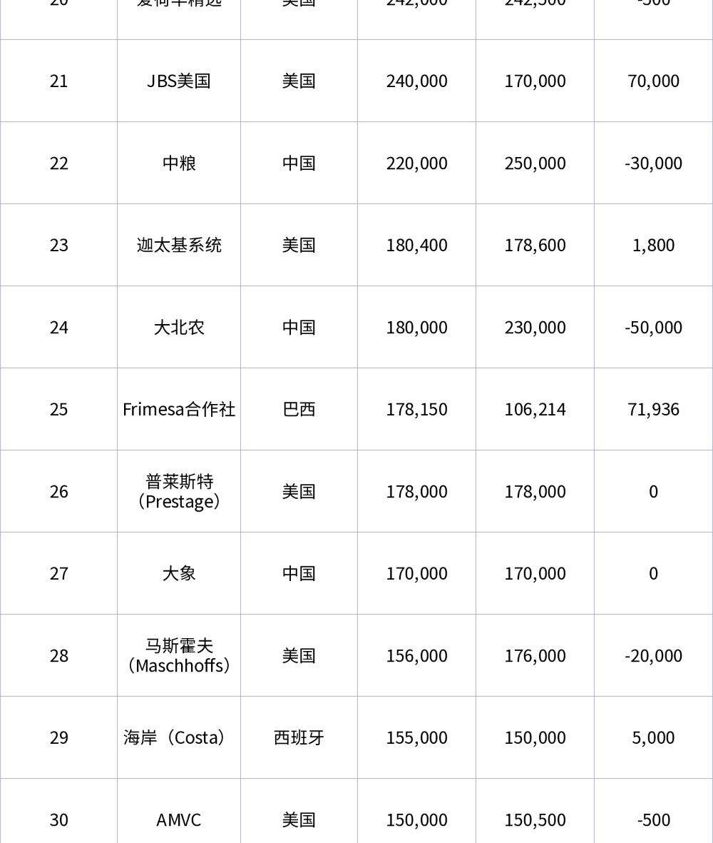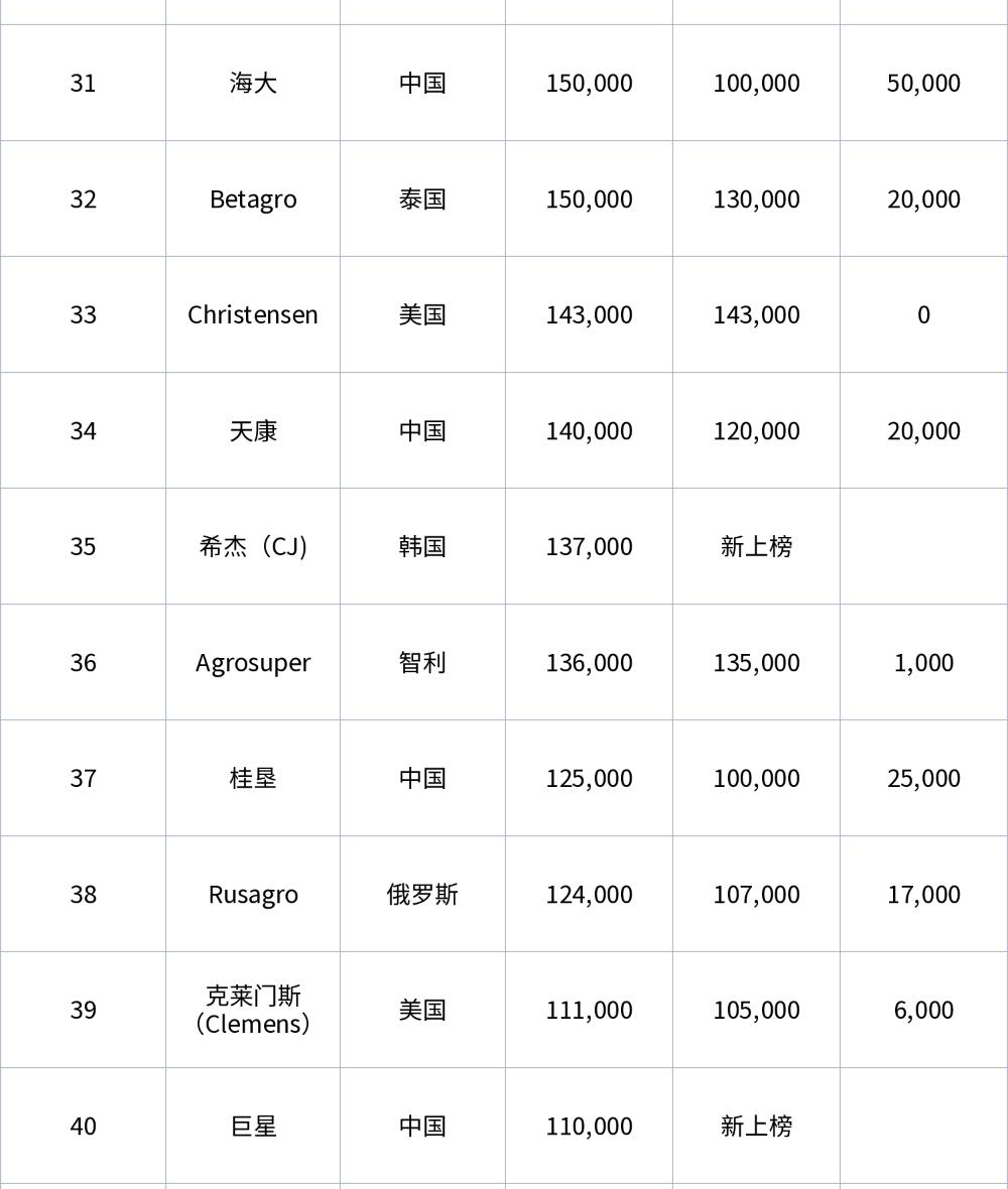 榜單總共涵蓋8個國家的50個公司共16,642,592頭母豬,其中中國24家、美國12家、巴西4家、西班牙3家、俄羅斯3家、泰國2家、韓國1家、智利一家。