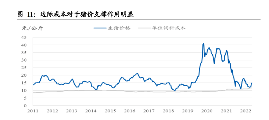 楔形區間下邊界取決于邊際成本,上邊界對應合理利潤。有時生豬產能過剩較為嚴 重,導致豬價下跌幅度較大,豬價明顯底部支撐。不同于市場主流的觀點,我們認 為豬價的成本支撐主要來自邊際成本,而非完全成本。對于養殖戶而言,前期仔豬 購買成本、固定資產折舊、疫苗藥物費用、甚至包括人工成本(因雇工工資不會因 養殖數量減少而同比例減少)都屬于沉沒成本,并不會影響其是否繼續育肥的決策。邊際成本主要考慮的就是飼料成本,其他如水電等費用占比較小。而生豬料肉比會 隨日齡增長而不斷提升,到達出欄階段料肉比普遍超過 3,即生豬體重每增加 1 公 斤需要飼喂 3 公斤飼料。如果當前 1 公斤生豬價格低于 3 公斤飼料成本,養殖戶的 理性選擇就應是停止育肥直接拋售。這就會導致生豬出欄體重低于正常水平,相當 于減少了未來一段時間內的豬肉供給,因而會對短期豬價形成較強支撐。正因如此, 飼料邊際成本構成了豬價楔形區間的下邊界。而楔形區間的上邊界則對應行業平均 合理利潤水平,一般情況為行業平均完全成本之上 10%-15%。