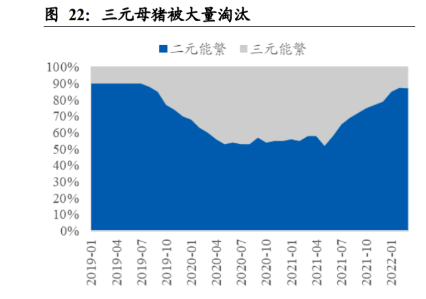 大量回交二元和三元母豬用于填補產能缺口。2018 年爆發的非洲豬瘟對于生豬產能 削減的規模空前——能繁母豬存欄于 2019 年 9 月跌至最低谷的 2631 萬頭,較疫情 發生前高點 4700 萬頭,下降約 44%。并且不僅父母代存欄驟減,祖代甚至曾祖代 存欄均受到明顯影響。這就導致了如果按照正常的補欄方式,相當長的時期內生豬 缺口都無法填補。為了盡快補充父母代母豬,養殖戶只能選擇用回交二元母豬(二 元母豬與純種大白/長白公豬配種所生)和三元母豬(原本商品代母豬轉而作為父母 代母豬使用)進行替代。