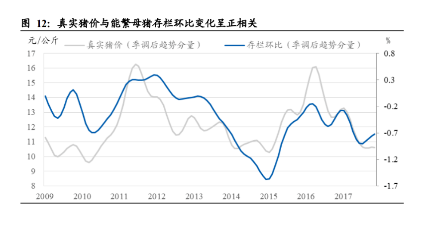 豬價走向決定產能增減。我們通過實證發現——真實豬價經季調后的趨勢分量與能 繁母豬存欄環比變化經季調后的趨勢分量呈現高度正相關,即行業產能的變化趨勢 與豬價走向密切相關,這與我們豬周期楔形區間波動模型的假設相符。同時,我們 也注意到能繁母豬存欄環比變化的中樞位于 0 線以下,這意味著行業所需能繁母豬 數量是在逐漸減少的。這是因為行業養殖技術持續進步,而豬肉需求量基本維持穩 定,母豬產仔效率的提升降低了對母豬數量的要求。因此,只有當存欄降幅大于母 豬產仔效率提升的程度,行業產能才能得到實際去化。