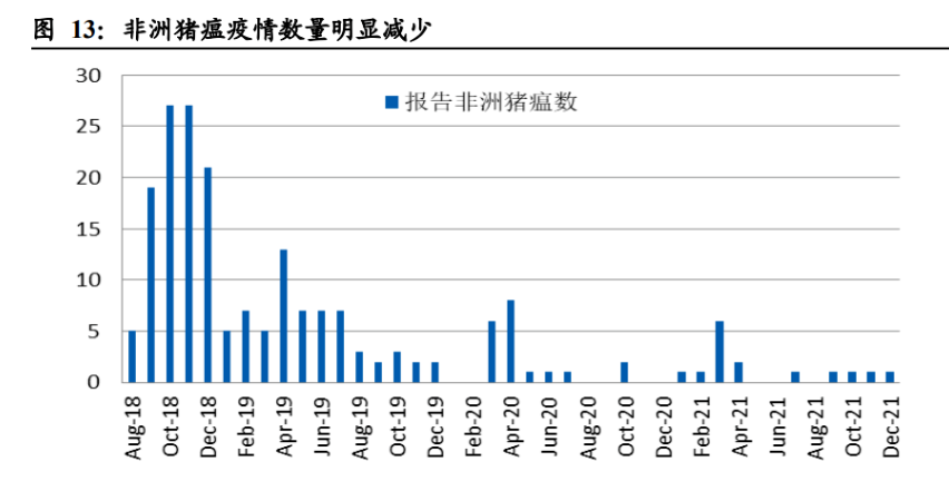 非洲豬瘟疫情得到有效緩解。當前對于我國生豬養殖行業威脅最大的疫病當屬非洲 豬瘟,從 2018 年 8 月爆發首起疫情至 2021 年末,累計共報告 196 起疫情,共撲殺 生豬 120 多萬頭。疫情最為嚴重的 2019 年,我國豬肉產量更是銳減 21.3%。可以說, 非洲豬瘟對生豬養殖行業以及國民生活都造成了巨大的沖擊。雖然目前尚未有合格 的疫苗或藥物面世,但我國生豬養殖行業自身通過不懈努力,采取加大飼料、豬舍 消毒力度等方式,使得疫情得到了基本控制。2021 年共報告非洲豬瘟疫情 15 起, 數量逐年減少,撲殺規模也大幅下降。總體而言,疫情對生豬養殖行業產能影響逐 漸減小,但決不能滋生僥幸心理,避免疫情死灰復燃。