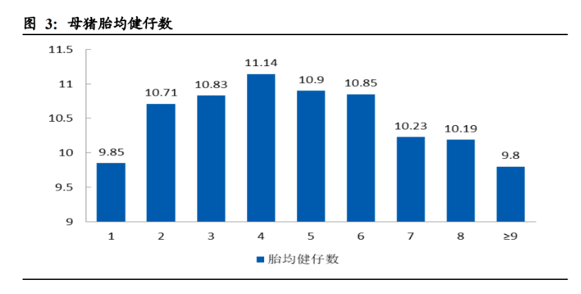 能繁母豬存欄是生豬養殖行業研究的核心。在配種過程中,公豬和母豬的合適配比 在 1:5 至 1:20,因此生豬產能的關鍵瓶頸還是在于母豬的存欄數量。一頭二元母豬 正常情況下能產 8-10 胎,平均每年可產 2.2-2.4 胎。綜合每胎產仔數和健仔率,母 豬的黃金生育階段在 3-6 胎。母豬是養殖場的核心資產,養殖場一般不會主動淘汰 胎齡小于 6 胎的高產母豬。