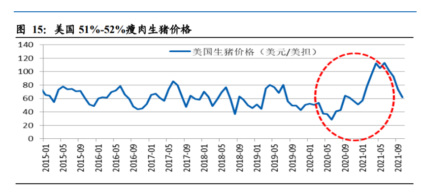2020 年美國豬場大量破產,隨后一年豬價出現暴漲。雖然我國養豬行業歷史上尚未 發生過如此慘烈的行業大面積破產情況,但美國生豬養殖行業卻剛剛經歷一場腥風 血雨。受到新冠疫情影響,2020 年 6 月美國 51%-52%瘦肉生豬價格跌至 28.45 美元 /美擔(折合約 4.44 元/公斤),創出近 20 年新低。這直接導致全美近萬家養豬場宣 布破產,甚至美國母豬存欄第 11 大的生豬養殖企業 Maxwell Foods 也被迫宣布永久 關停生豬養殖業務。而伴隨大量企業退出,行業產能也徹底出清,豬價隨即也開啟 一輪暴漲。2021 年 6 月,美國 51%-52%瘦肉生豬價格達到 113.02 美元/美擔(折合 約 16.00 元/公斤),同比上漲 297%。