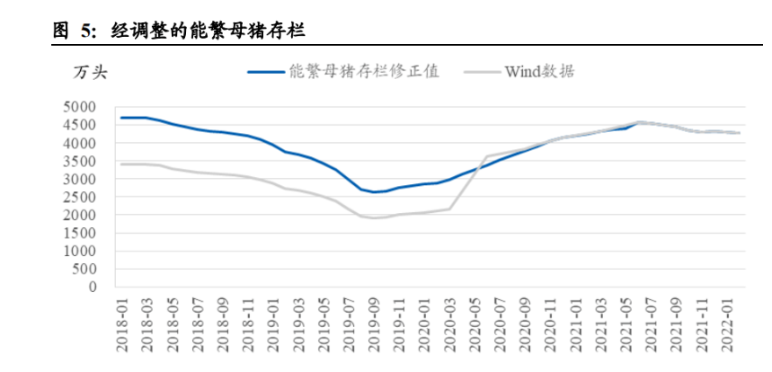 我們重新修正了數據,更為接近農業部官方口徑。由于農業農村部能繁母豬數據時 間跨度更長且更為高頻,也被市場更為廣泛采用,因此我們以農業農村部官方新聞 稿中給出的 2021 年 5 月能繁母豬存欄 4400 萬頭為基準,再根據每月官方給出的存 欄變化率,對能繁母豬存欄進行了調整修正。根據修正后的數據,2018 年 12 月末 能繁母豬存欄為 4110 萬頭,再根據同比變化率得出 2017 年末能繁母豬的存欄應為 4482 萬頭,與農業部官方數據 4470 萬頭基本符合。考慮到數據保留位數,我們認 為該修正值數據序列已經接近農業農村部官方數據。為更真實地反映生豬養殖行業 實際情況,以下我們所采用的能繁母豬存欄數據均采用調整后的修正值。
