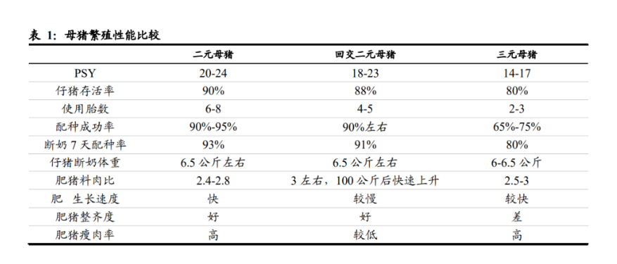 三元母豬和回交二元母豬生產效率均不及二元母豬。三元母豬有一半杜洛克血統, 導致其繁殖性能不佳——發情不明顯,返情嚴重,配種成功率低;窩均產仔數偏低, 仔豬存活率也較低;并且其泌乳性能差,使得仔豬初乳攝入量不足,斷奶窩重較二 元母豬少 3-5 公斤。綜合來看,三元母豬的生產效率較二元母豬下降 20%以上,令 商品豬攤銷成本大幅提升,嚴重侵蝕養殖場利潤。而二元回交母豬所產肥豬則缺乏 杜洛克血統,雖然繁殖性能接近二元母豬,但商品豬的生長速度較慢,尤其超過 100 公斤后料肉比會快速上升,并且肥豬整齊度差、瘦肉率低,豬肉收購價格也略低于 外三元生豬。因此,三元母豬和回交二元母豬都是行業在母豬嚴重不足時的權宜之 計,隨著二元母豬供給恢復,大部分三元母豬和回交二元母豬都會被逐漸替代。