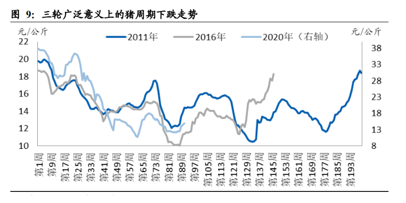 豬周期的牛短熊長。豬周期還有一個最為養殖戶詬病的特點——牛短熊長。往往行 情一起來,就立即加大補欄力度,但等到了生豬出欄時,豬價就已掉頭向下了;反 之,當豬價陷入谷底時,可能行業持續低迷,幾年內都持續虧損。從 2007 年以來 的 3 輪豬周期來看,情況的確如此。一輪泛周期上漲平均持續時間僅 16 個月,而 下跌平均持續時間則達到了 33.3 個月。